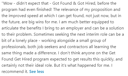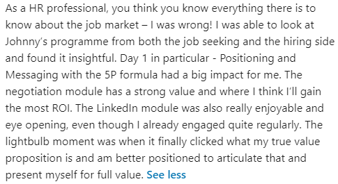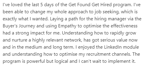 Each day you’ll get huge breakthrough moments that will transform how your CV, LinkedIn Profile, Personal Network and Recruitment Relationships will work to make sure you get your ideal job faster, for more money, without having to sell yourself.